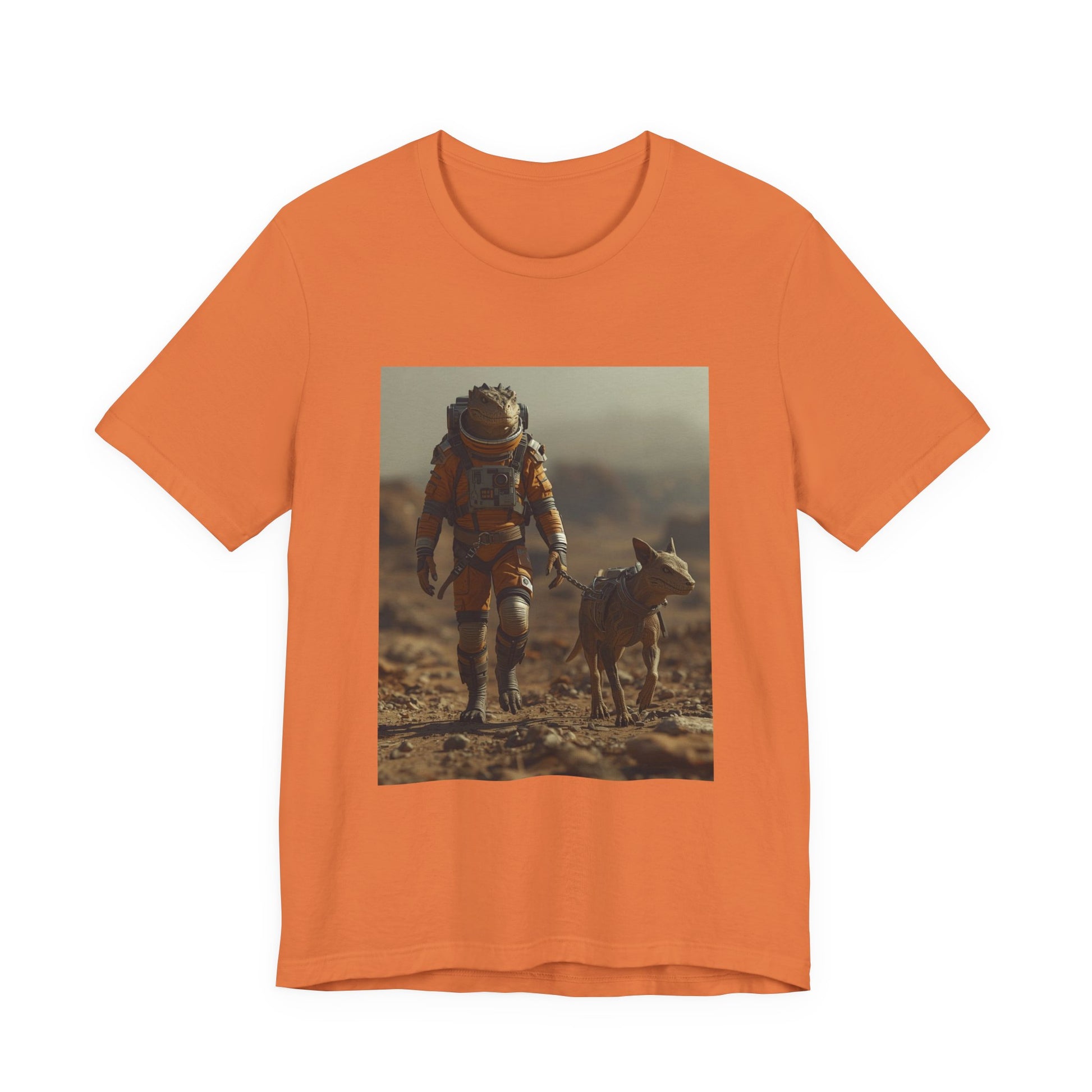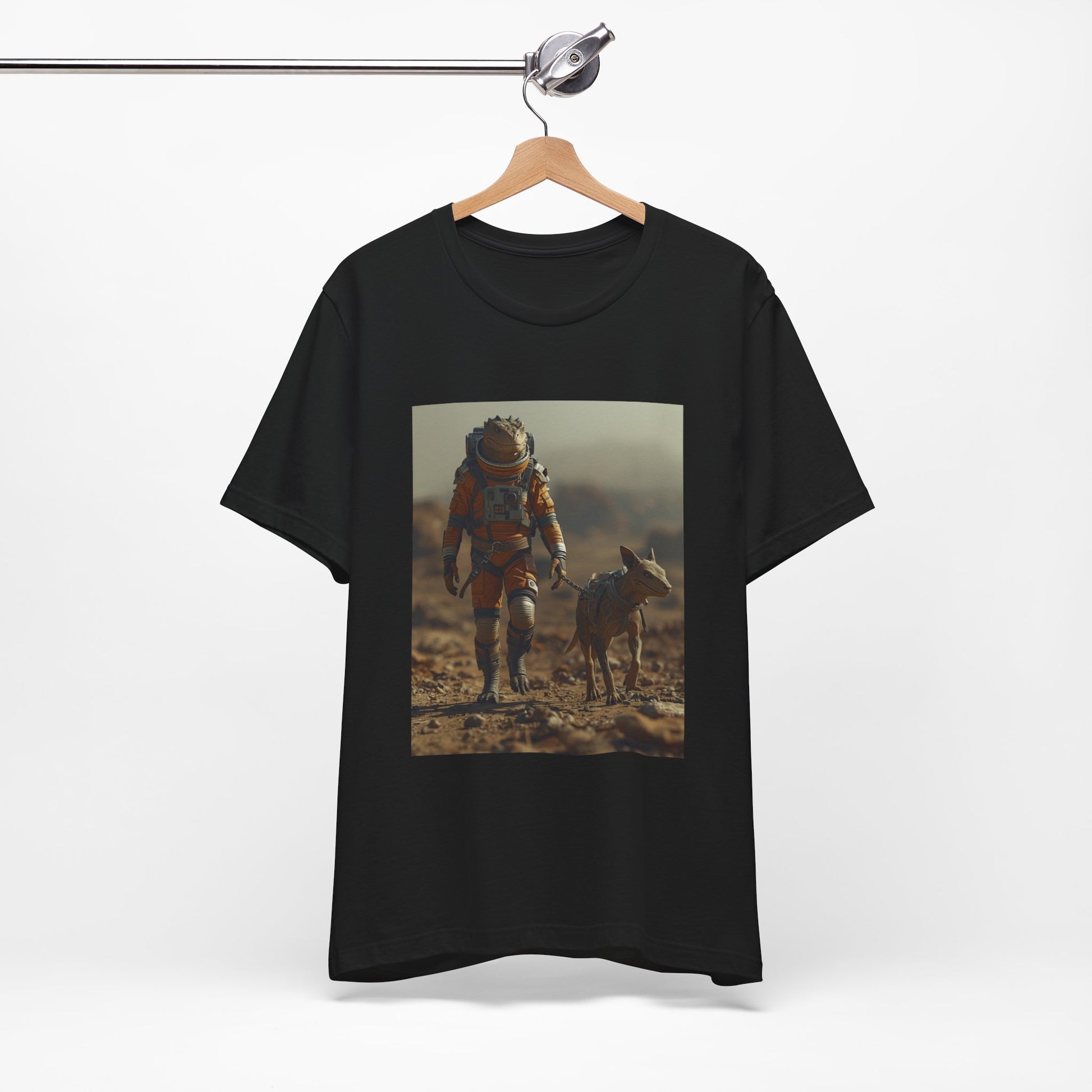 Soft, breathable cotton meets a quiet moment of exploration. This lightweight jersey tee carries a single, cinematic print of an astronaut and a loyal canine companion wandering a dusty, otherworldly landscape. Wear it layered under a jacket on cool mornings or alone in the heat—its retail crew neckline and tear-away label keep the focus on comfort while the image sparks conversations about adventure, solitude, and companionship. The balanced fit sits tidy at the shoulders and drapes naturally, making the shirt feel lived-in from day one.