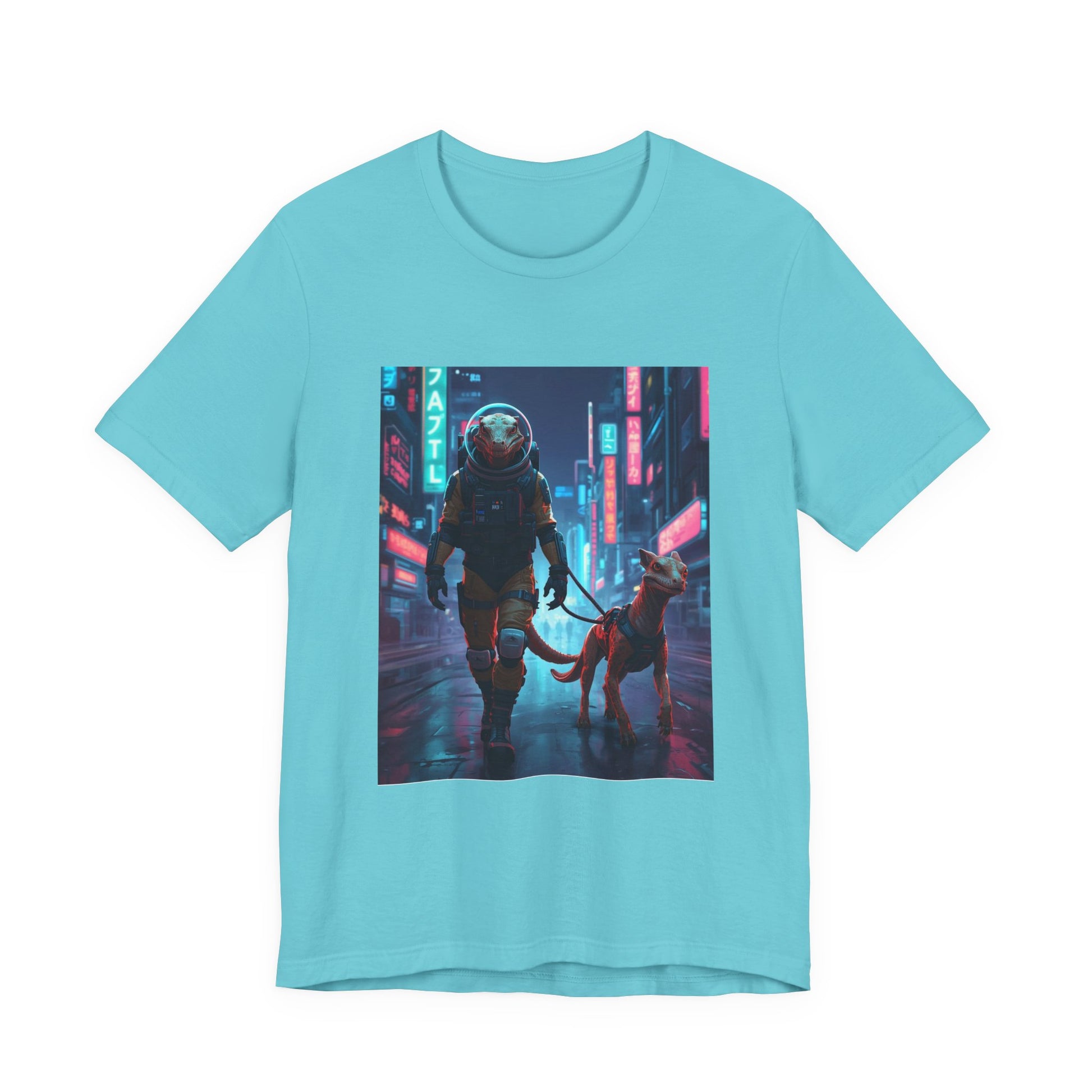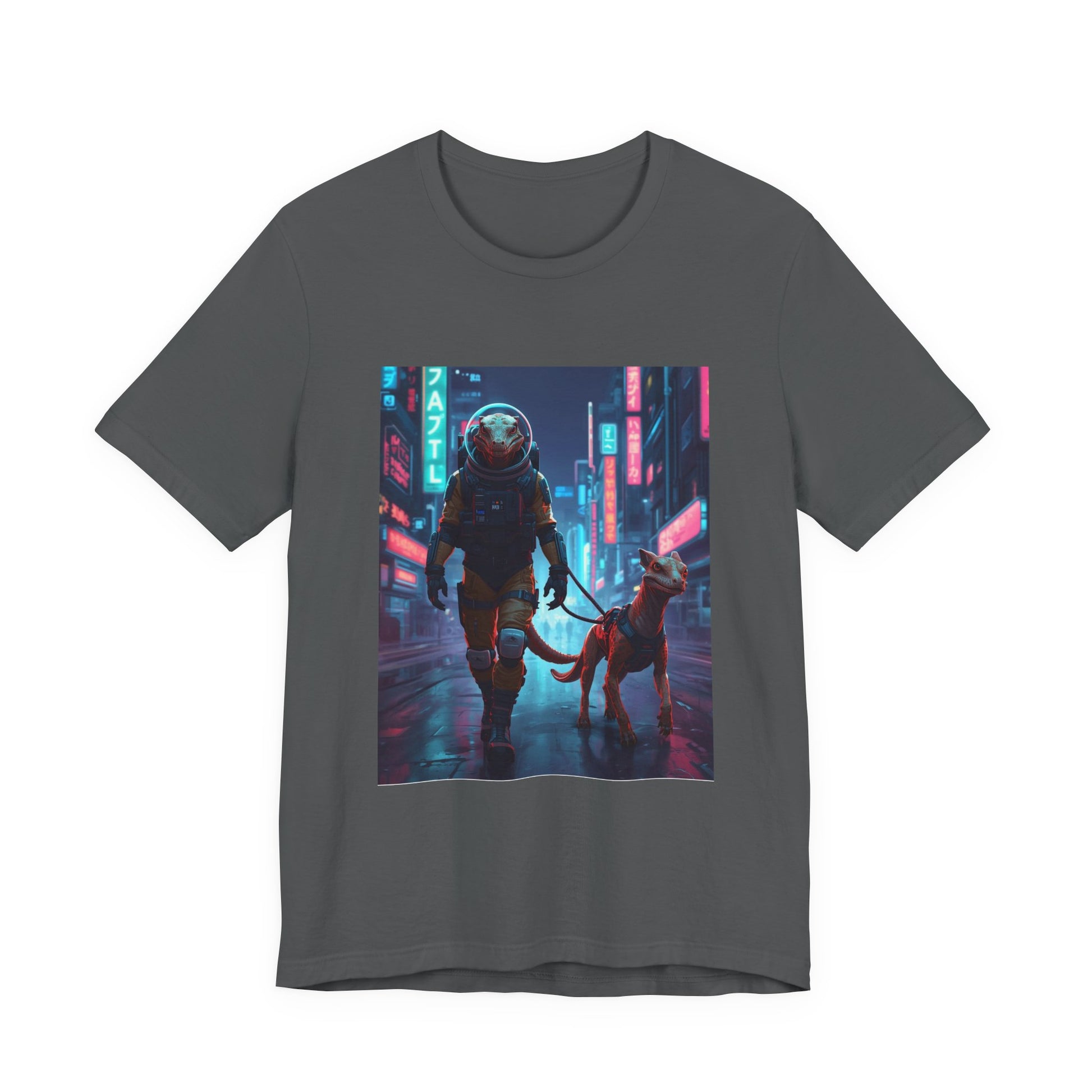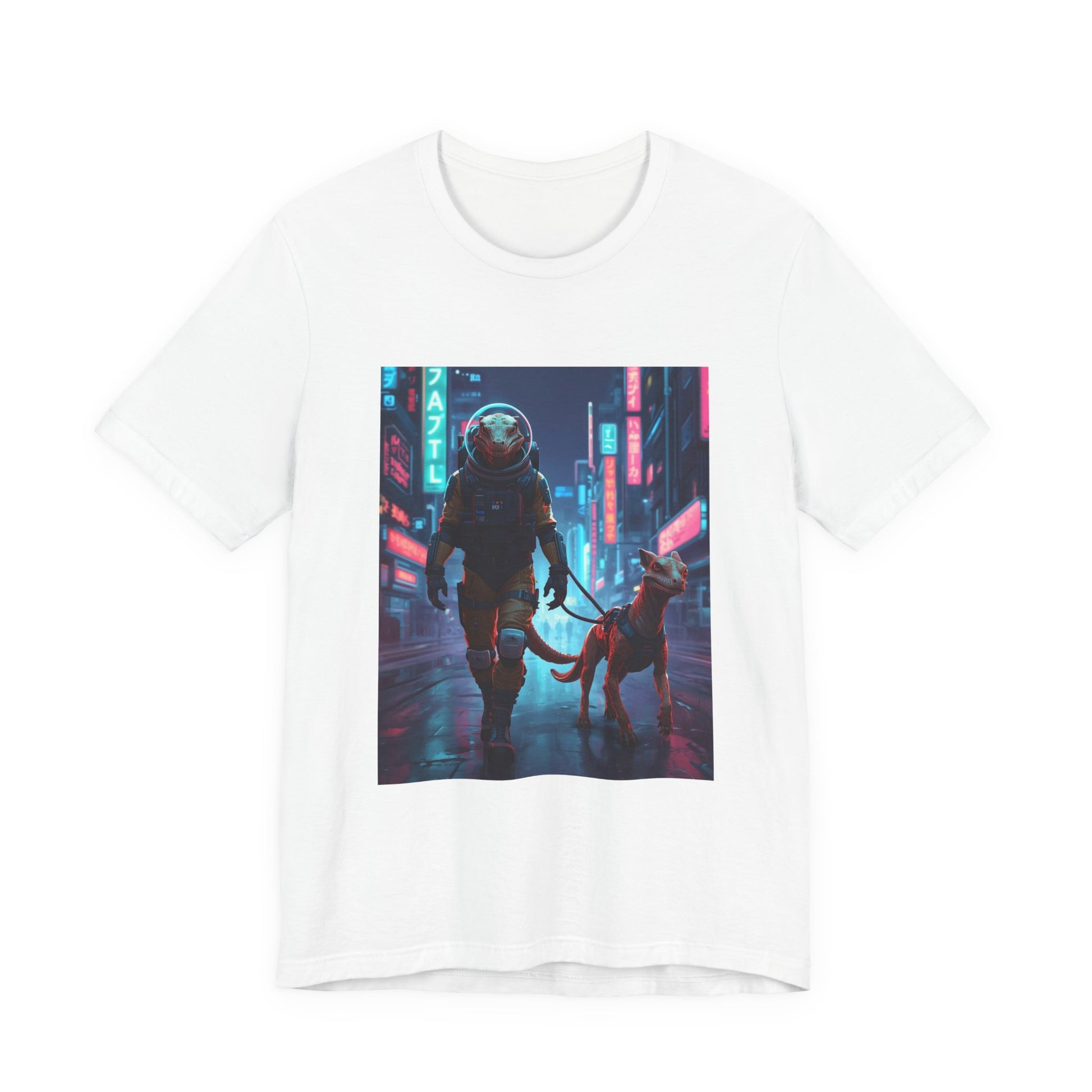 This lightweight jersey tee carries a bold, cinematic print that blends neon-soaked cyberpunk streets with quiet companionship — an astronaut walking a dog under rain-slick signs. It feels like a late-night walk through a futuristic city: reflective pavement, glowing storefronts, and the steady company of a loyal companion. Wear it when you want to add a story to your outfit — casual enough for day-to-day, striking enough to start conversations. The soft Airlume cotton keeps the image sharp while staying breathable for layering or solo wear. Thoughtful construction details — side seams, ribbed collar, and shoulder tape — keep the silhouette neat through repeat washes, while the tear-away label prevents irritation. REACH certified and responsibly produced, this tee suits someone who loves speculative worlds, urban nightscapes, and quiet moments of connection.