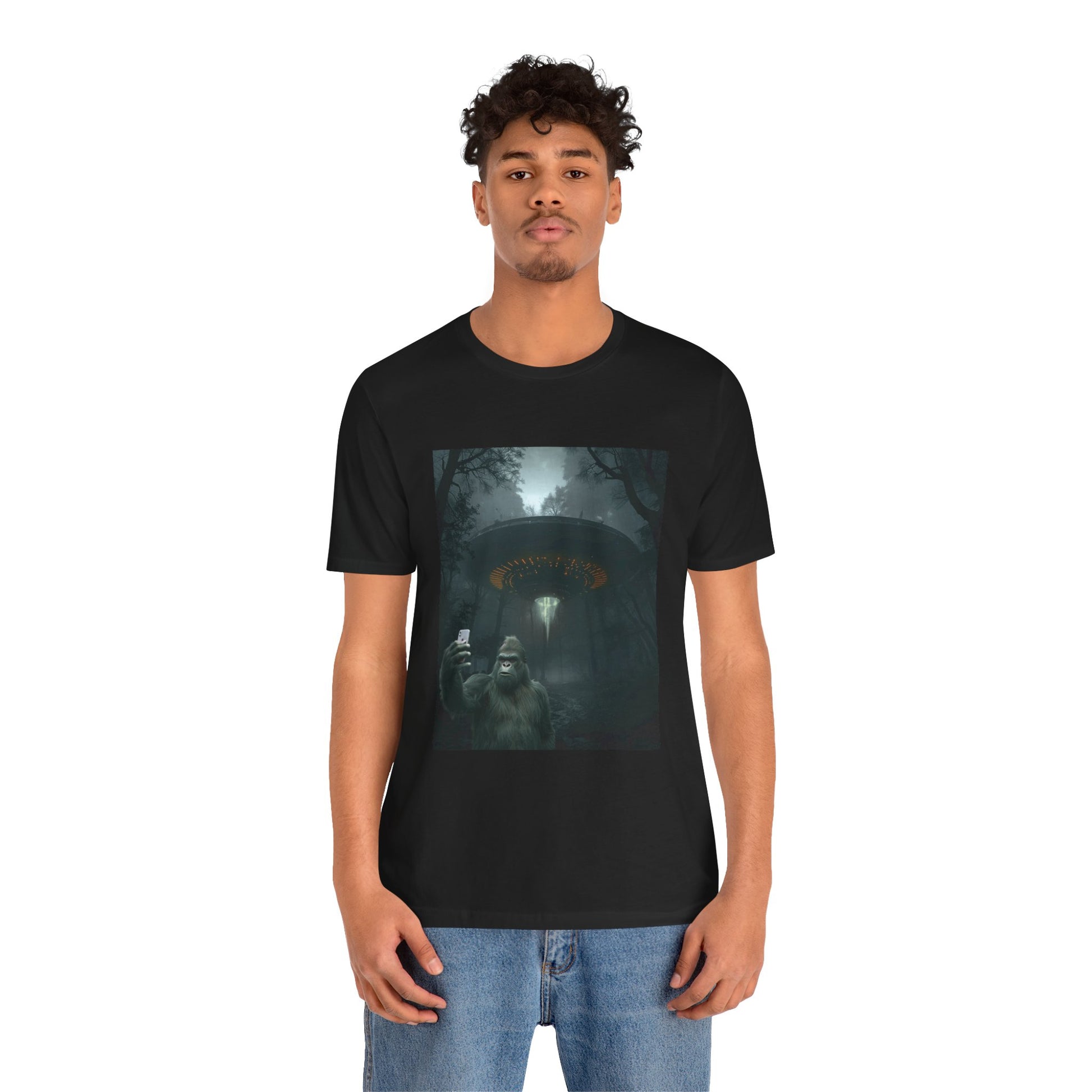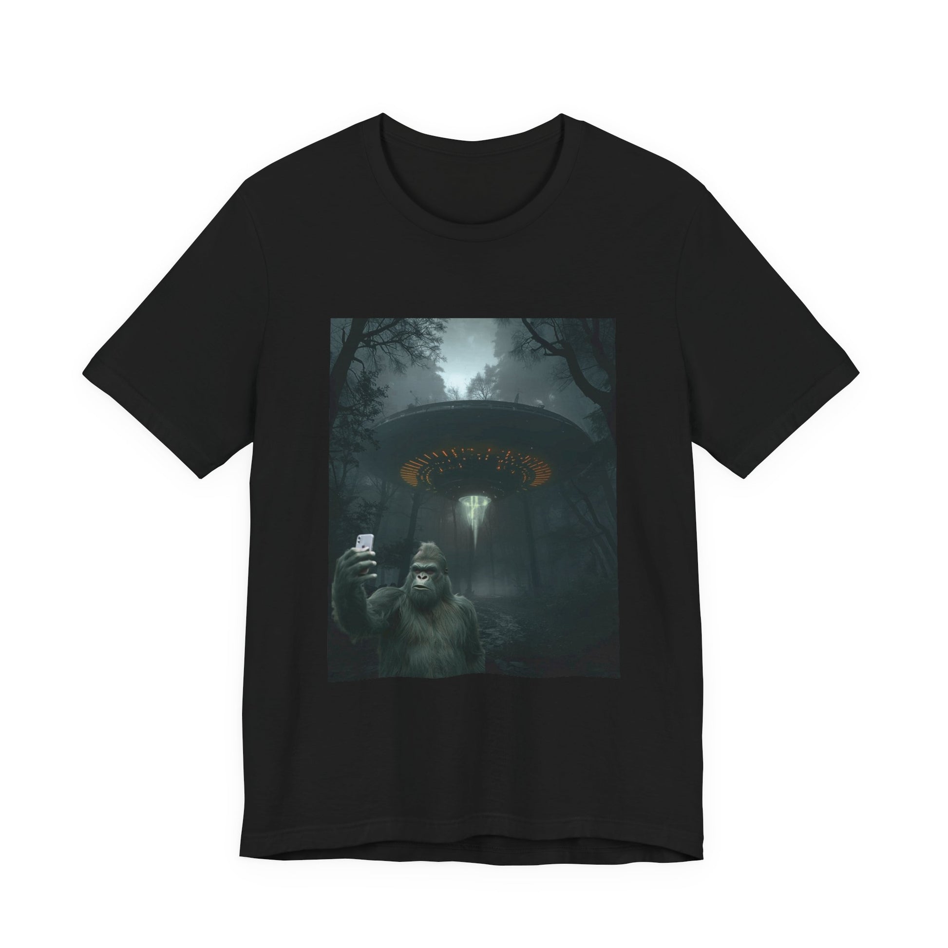 A lightweight, breathable jersey tee printed with a moody forest scene: a curious Bigfoot taking a selfie while an otherworldly UFO glows above. The soft Airlume combed cotton feels gentle against skin and layers easily under jackets. Subtle structural details — side seams, ribbed collar and shoulder tape — keep the shirt shaped wash after wash. The print uses high-detail DTF/DTG techniques for crisp, deep colors that hold in low-light tones. Wear it when you want a shirt that starts conversations — equal parts spooky campfire tale and late-night humor.
